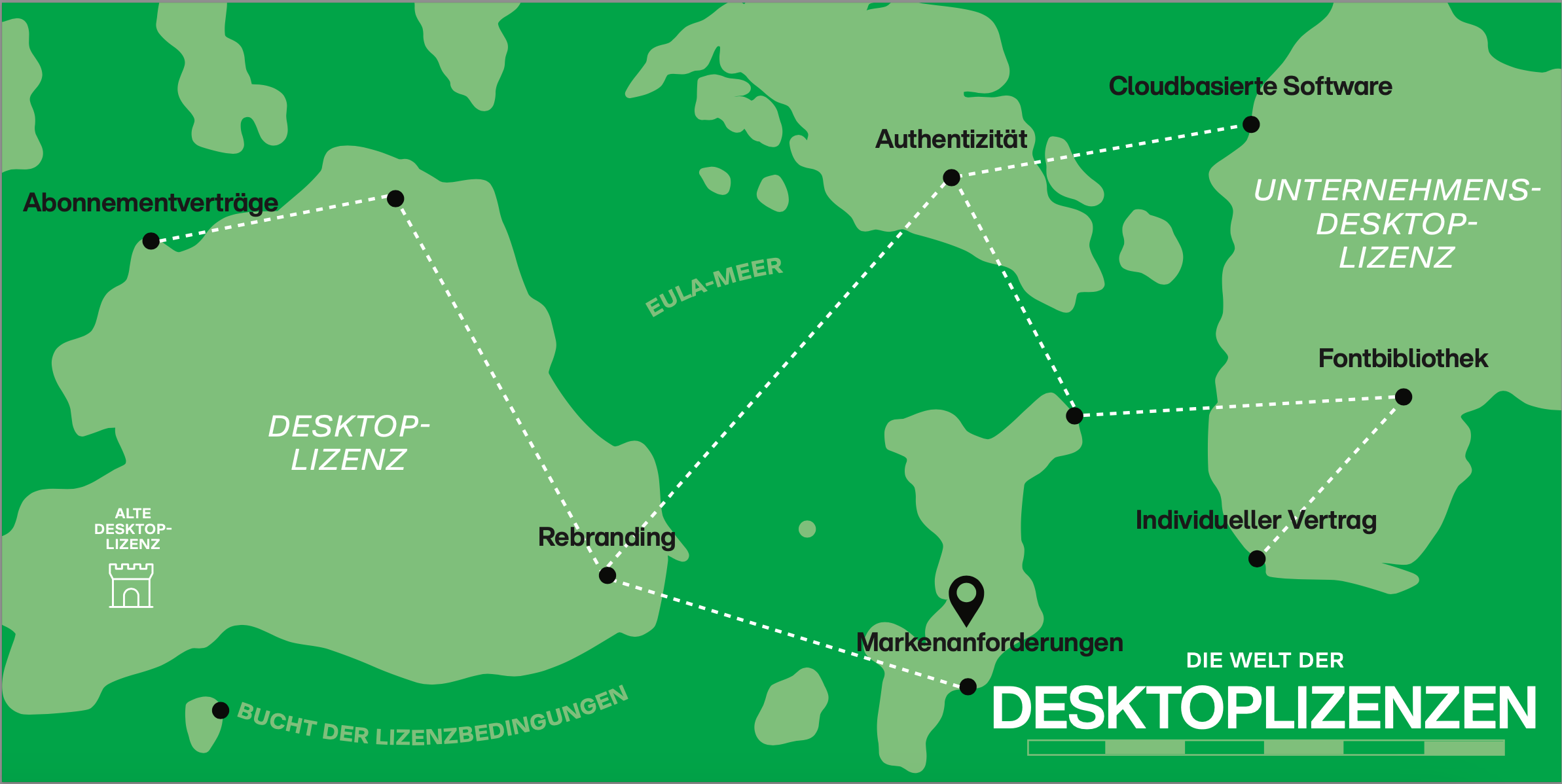 Was ist der Unterschied zwischen einer Company-Desktop-Lizenz und einer normalen Desktop-Lizenz? Wann ist es sinnvoll, bei der Font-Lizenzierung auf die Cloud umzusteigen? Seien wir ehrlich: Lizenzentscheidungen können schwierig sein, es sei denn, Sie haben eine Infografik im Stil eines Brettspiels, die Sie durch den Prozess führt.