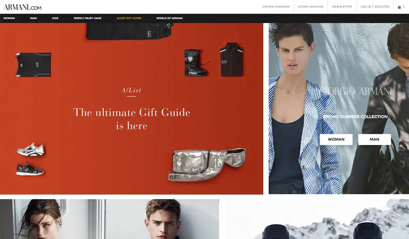Der haarfeine Charakter des Armani Didot Logos tritt zuweilen in den Hintergrund, aber diese Schrift ist ein klassisches Beispiel für Luxus, Stil und Couture. Montserrat ist ein robuster, offener und harmonisch geometrischer Sans. Dunkle, maskuline Farben erstrecken sich über die Landschaft und die seriöse Bildsprache. Die Marke ist modern, klassisch und legendär – und die Typografie spiegelt dies wider.