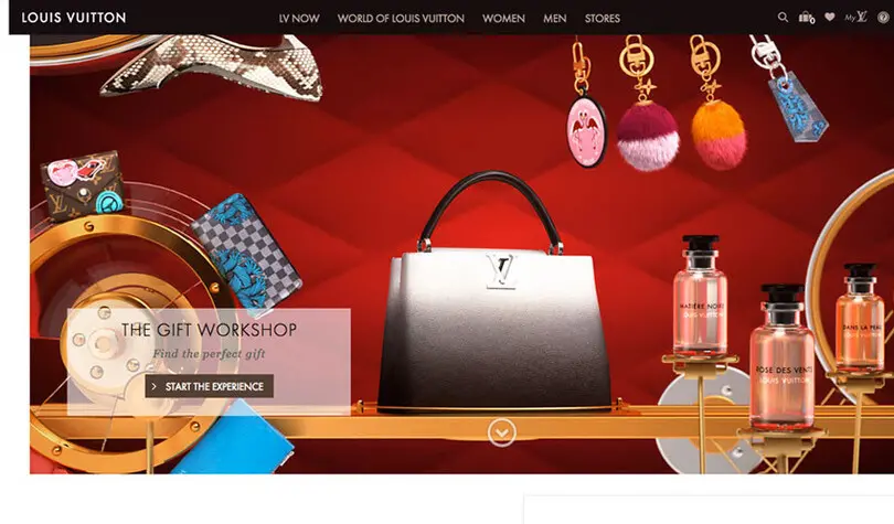Das exklusive „LV“-Monogramm hat dicke, klobige Serifen und gewichtete dünne Striche. Es basiert auf der Schriftart Georgia und wirkt stark und robust. Futura wird für die Wortmarke „Louis Vuitton“ und den Text verwendet, sodass ein schönes visuelles Gleichgewicht zwischen den beiden Schriften entsteht, die sich voneinander gut absetzen. Auf ihrer Website wird Georgia auch für Text eingesetzt, wobei Austin Roman und LV Clemence sporadisch verwendet werden, um eine leicht verwirrende typografische Hierarchie zu schaffen.