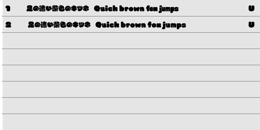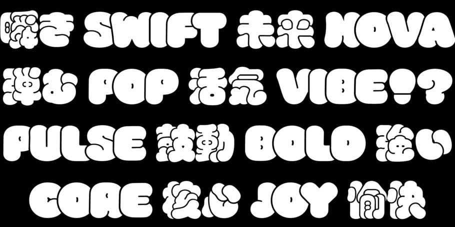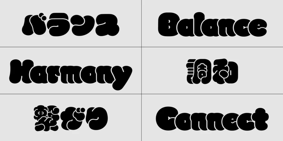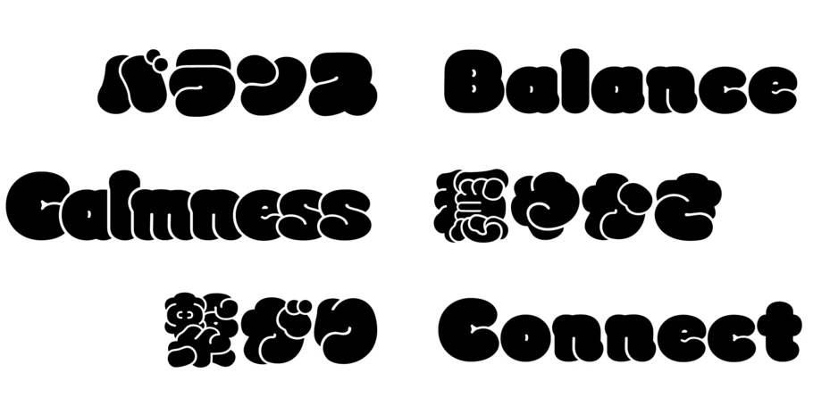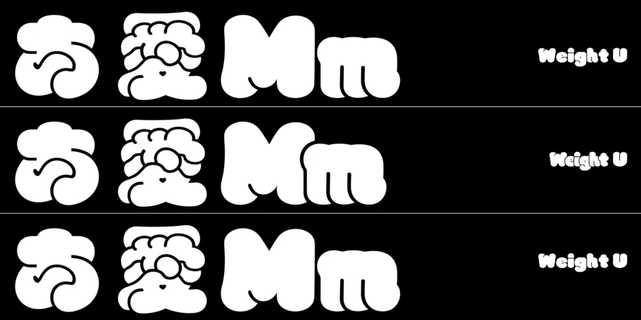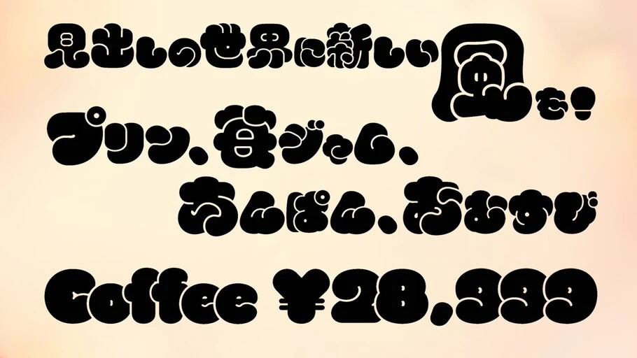 文字の内部空間を極限まで詰めた超極太のウェイトは、印象的な見出しやタイトル用途に最適で、ポスターや広告、パッケージデザインなどで圧倒的な視認性とインパクトを発揮します。丸みを帯びたシルエットと、文字内部のユニークなカーブが、ポップで親しみやすい印象を与え、楽しさや柔らかさの表現にも適しています。さらに、独特な文字の形状は和風・レトロな雰囲気を生み出し、ノスタルジックな演出にも効果的です。
