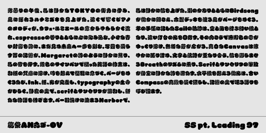筑紫書体シリーズである筑紫AN丸ゴOVは、従来の筑紫書体のイメージを覆す、新たなコンセプトで制作された書体です。 「既存の重なりや食い込みのある書体からの脱却」をテーマに開発されました。超極太のウェイトによって、文字内部の空間がほとんど消えるほどの重なるスタイルは、見出しとして圧倒的な存在感と強いインパクトを放ち、動物のようにも見えるユニークな文字フォルムは、文字組の世界に新たな表情と豊かさをもたらします。「OV」は「Overlap」の略で、文字を構成するパーツの重なりを筑紫AN丸ゴシックの超特太(Ultra)ウェイトで力強く表現。 筑紫AN丸ゴの「AN」は「アンティーク」を意味します。